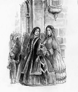 Pudimos observar a las damas que comenzaban a ingresar al templo, luciendo hermosos vestidos negros, o con los últimos avances de la moda. Crinolinas de suave textura, los polizones y armados de alambre de las faldas, y las fajas francesas o inglesas, acentuaban el donaire y enclaustraban las cinturas de las cientos de damas y jovencitas que entraban en una procesión espontánea.A las tres de la tarde nos retiramos de casa de los Claro Solar y, al pasar cerca de la plazoleta de la Compañía de Jesús ya se apreciaba una gran cantidad de señoras y familias completas que se preparaban para ingresar al templo, llevando los choapinos enrollados, único asiento para las mujeres que asistirían a la ceremonia. La ansiedad por ingresar era notoria; lo más importante era lograr una buena ubicación en el estrecho templo, estar lo más cerca del púlpito donde, según aseguraban, iba a predicar el mismísimo obispo Eyzaguirre.