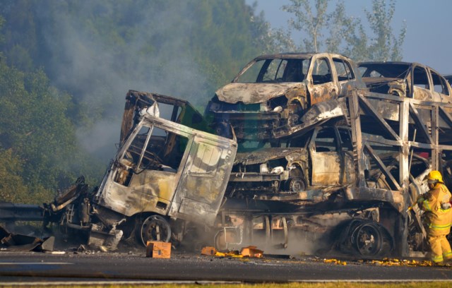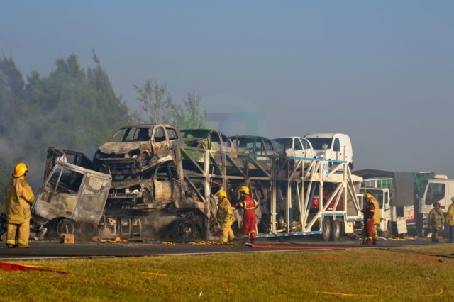 De acuerdo a relatos de testigos y victimas, todo comienza con un camión que circulaba en el sentido Bs. As. – Rosario y supuestamente por la intensa niebla mezclada con el humo del basural, se cruza de carril y queda cubriendo toda la calzada del carril Rosario – Bs. As. Dicho camión que transportaba bolsas de cemento es embestido por un Volkswagen Senda, detrás de este auto venían dos camiones que son chocados por un vehíc*** de carga que transportaba automóviles 0 Km, a raíz de ese impacto se incendia la cabina y los autos transportados.