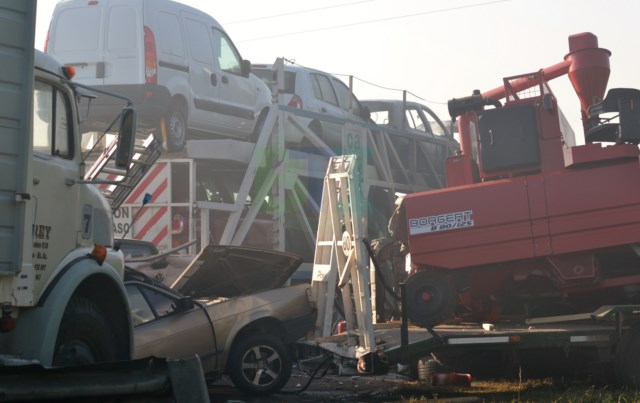 Contra este camión chocan tres camionetas, un auto, tres camiones, un Peugeot Megane, que queda aprisionado donde fallecen las dos personas de nuestra ciudad y dos vehículos mas, cerrando el primer accidente múltiple y el más importante.